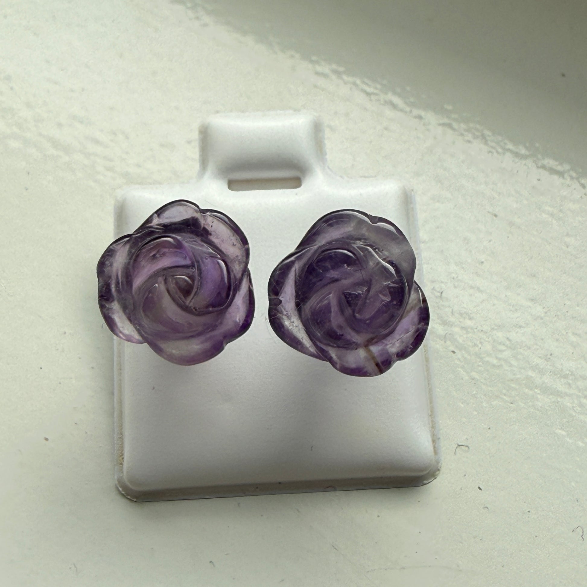 These Carved Amethyst Rose Stud Earrings feature natural amethyst shaped into delicate hand-carved roses. Each stone measures approximately 9 x 9 mm, with its own unique swirls, tones, and petal details — a natural variation that makes every pair one of a kind.