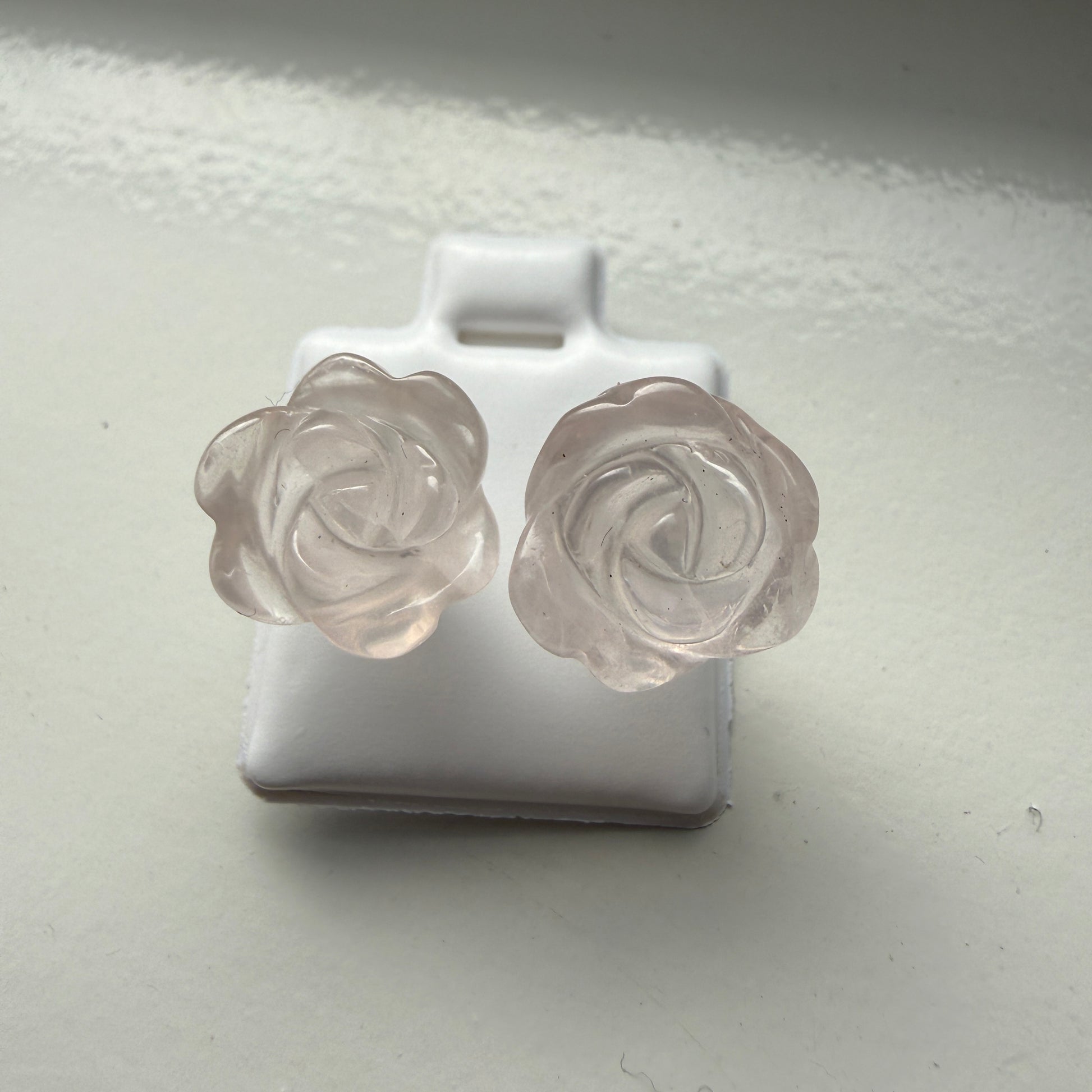 These Carved Rose Quartz Rose Stud Earrings feature natural rose quartz shaped into delicate hand-carved roses. Each stone measures approximately 9 x 9 mm with a naturally pale, soft pink tone. Because rose quartz varies in shade and carving detail, each pair will look slightly different. We have two pairs available, so you may not receive the exact one photographed, but all are similar in tone and quality.