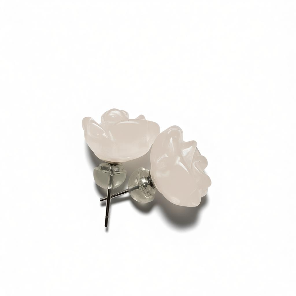 Carved Rose Quartz Rose Stud Earrings – 9 x 9 mm – Sterling Silver