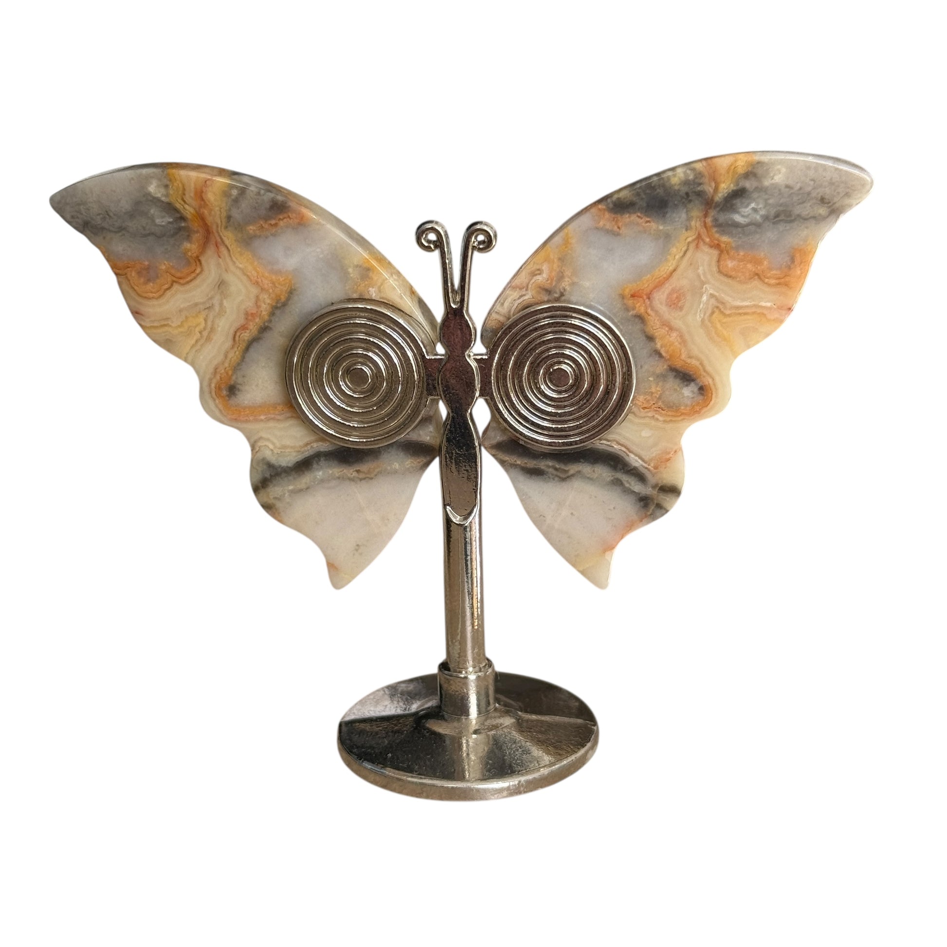 These Crazy Lace Agate Butterflies are carved natural stone pieces set on a metal stand, standing approximately 6–7 cm tall. Each butterfly shows unique lace-like patterns in cream, honey, grey, taupe, and soft rust tones — no two pieces look the same. The wings are securely fixed at the back with strong adhesive, as shown in the photos.