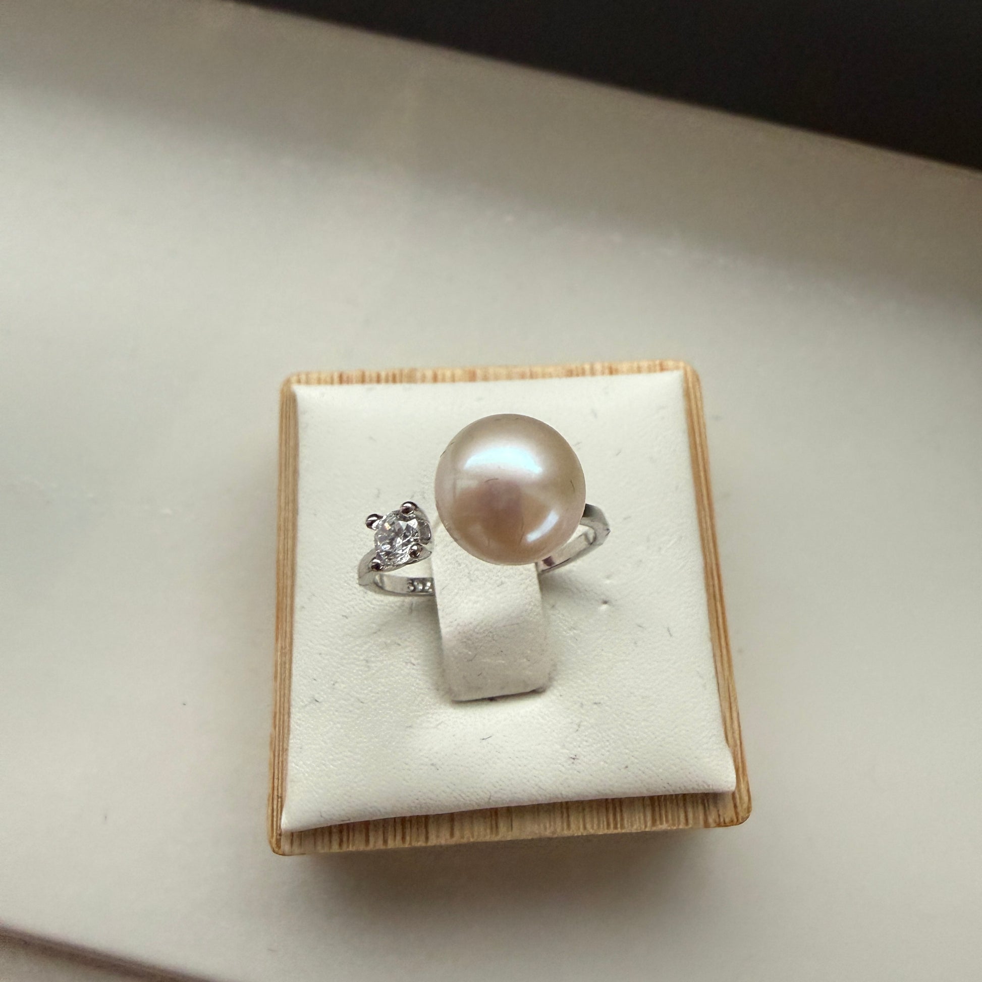 This ring features a natural peach-tone freshwater pearl measuring approximately 9 mm, paired with a 3 mm cubic zirconia accent on a sterling silver open band. The colour sits between soft peach and warm blush, giving the pearl a calm, feminine glow.