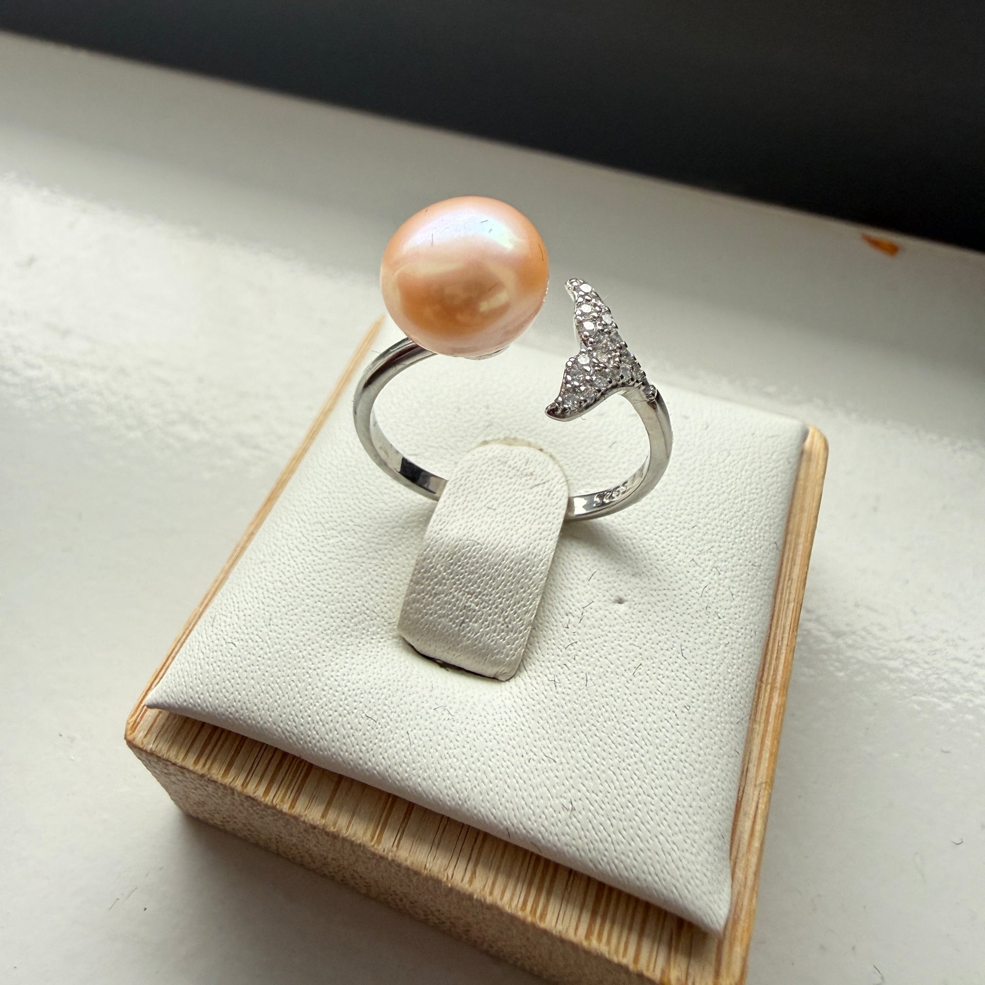 Orange Freshwater Pearl Whale Tail Ring – Adjustable Sterling Silver (7 mm Pearl)