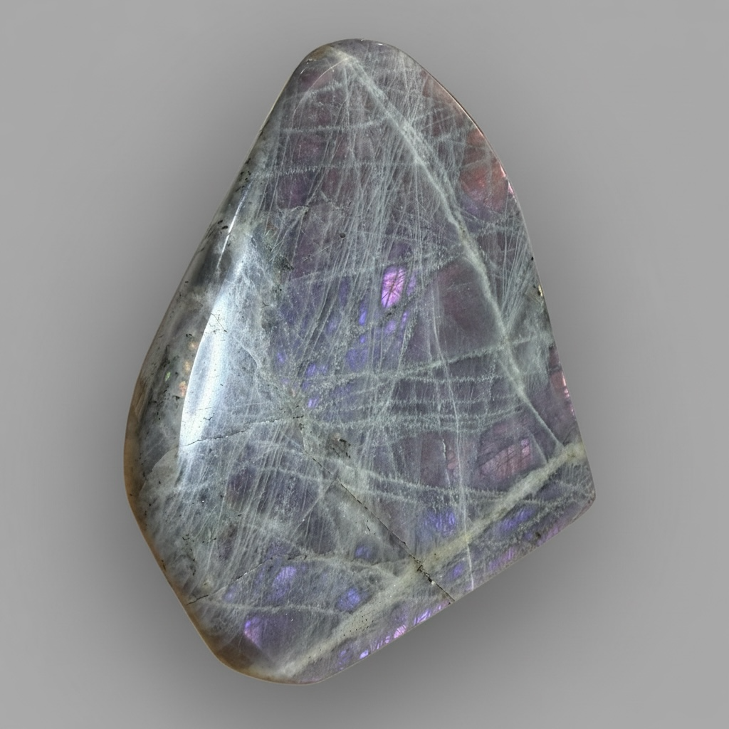This standing purple labradorite freeform measures approximately 11 x 9 x 4 cm and weighs around 840 g. Its surface holds a deep, shifting play of colour — flashes of violet, lavender, soft magenta, and hints of blue — appearing and disappearing with movement, just as labradorite is meant to. Photographed indoors for clarity, but the purple flash shows beautifully in natural light too.