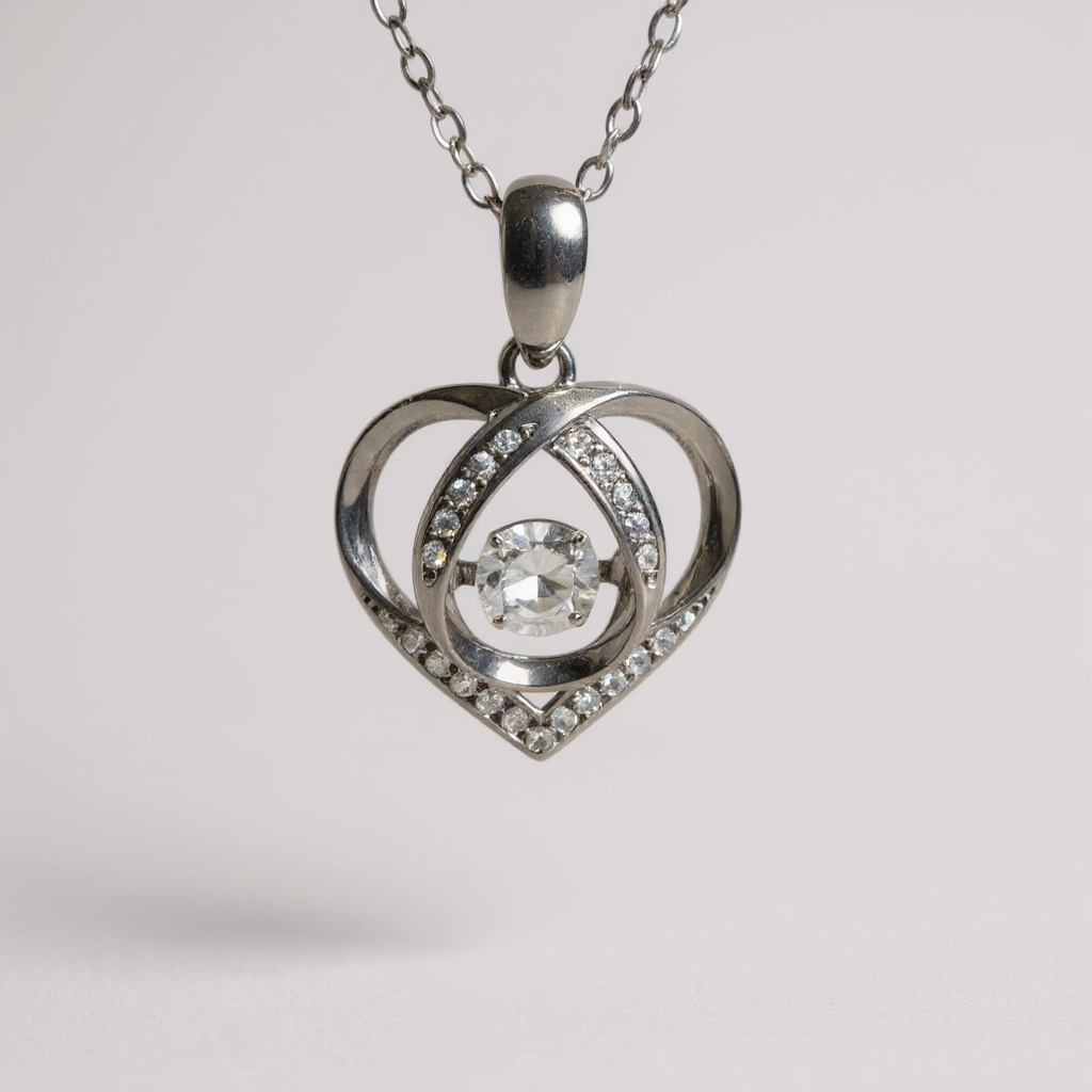 This sterling silver necklace features a delicate heart-shaped pendant with a free-rotating moissanite centrepiece. The moissanite sits suspended inside the heart, turning gently with movement and catching light from different angles. The outer heart is lined with small cubic zirconia accents, adding a soft, elegant sparkle without overwhelming the design.
