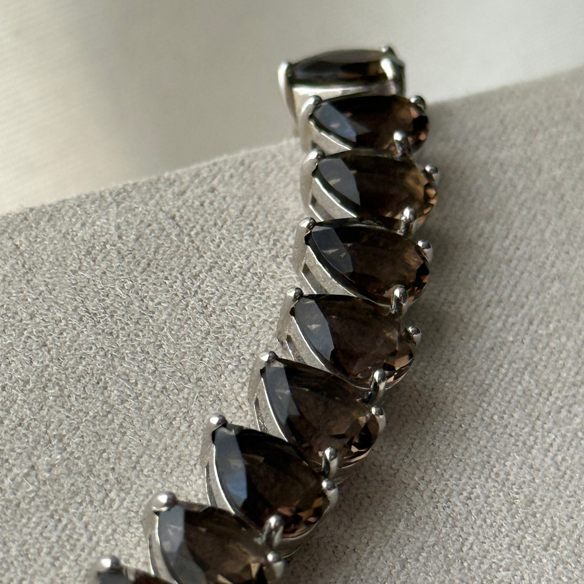 This sterling silver tennis bracelet features 25 teardrop-cut smoky quartz stones, each secured in a classic claw setting. The rich brown-grey tones shift softly with the light, giving the piece a warm, elegant glow that feels both earthy and refined. Finished with an open box clasp and double side safety latches, it’s a secure and sophisticated bracelet you can wear for everyday polish or evening style.